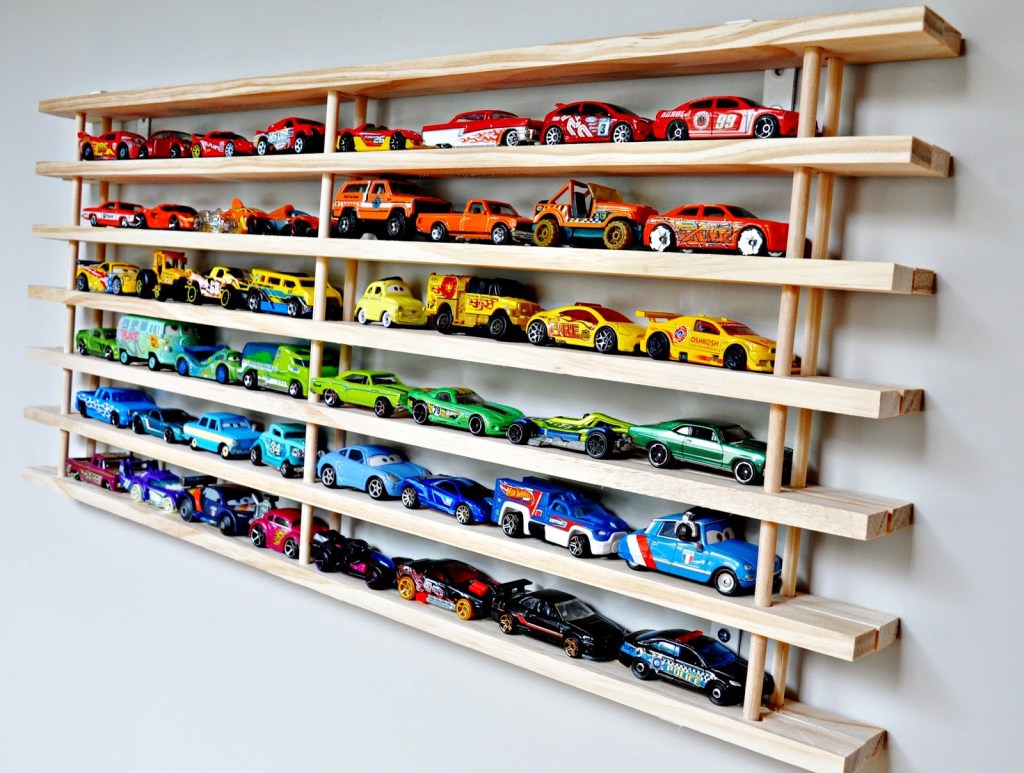 My son was a Hot wheel’s fan, we tried a big box, but he always wanted to have them out and visible. So, we switched to a wall mounted rack. It was perfect! He would spend hours arranging them and because he loved the display, he was always happy to tidy them up himself.
