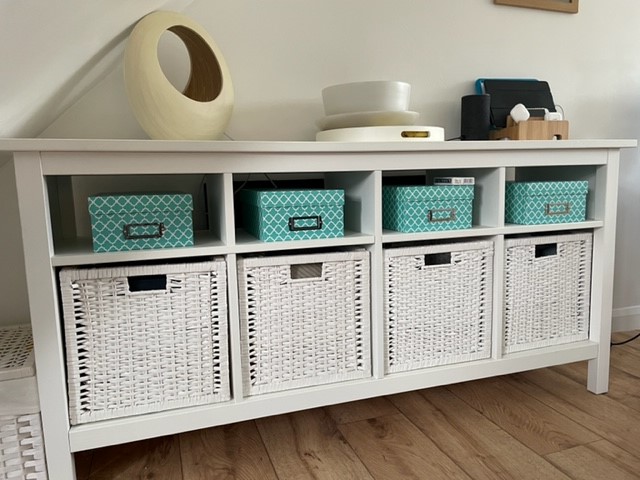 The almighty Kallax is every one’s favourite (including me) but I’d keep this in the kids Bedroom. If you store toys in the living room consider the Hennes Console, it hides a lot of toys & Games but is a little more stylish. Here is mine: I store cards, small games and all those annoying knick-knacks that kids get and won’t throw away in the pretty green boxes (Can you spot the deck that didn’t get put away properly yesterday!).