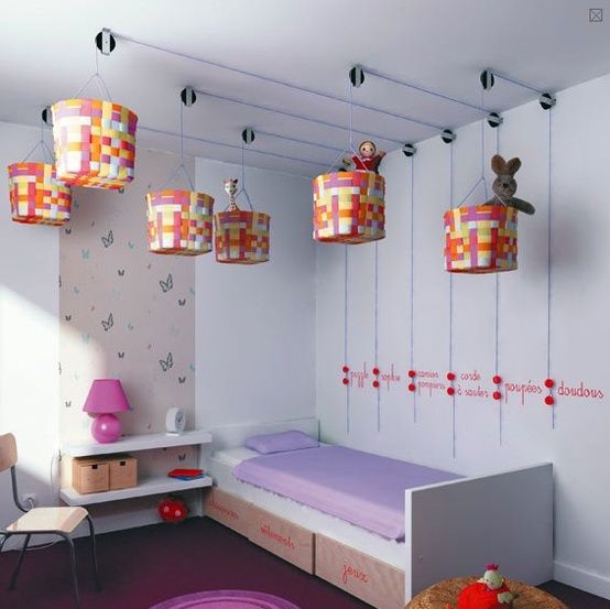 Think Upwards – Use Pulleys: We have all seen these in the laundry or the garage, why not use the same system for the playroom. Just add some pretty boxes and some colourful cord and you are all set. Just be sure not to store anything heavy up there. Best for soft toys / Duplo / dolls etc.