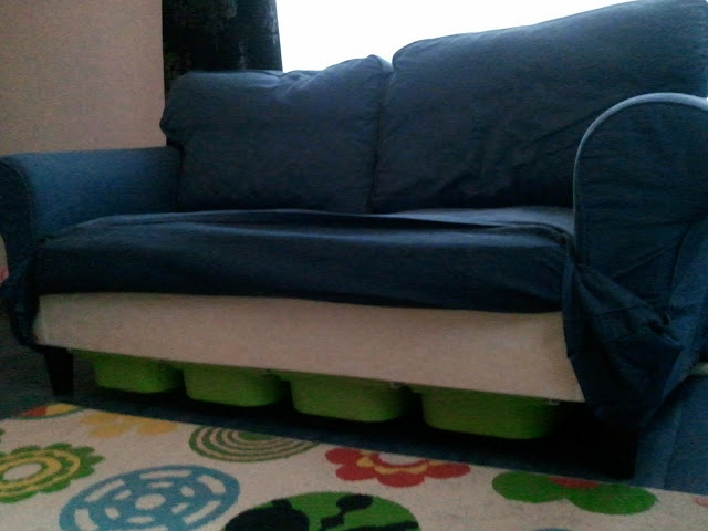 Sliding drawers under the sofa: If you are into a spot of DIY, here is a fantastic idea from Ikea hackers. Awesome for storing just about anything. (When the kids grow out of toys you can hide your wine collection under there!)